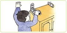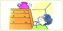 - 옷장이나 그릇장, 냉장고 등이 넘어 지지 않도록 고정 기구 등으로 고 정해 둔다.