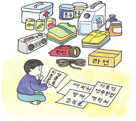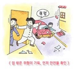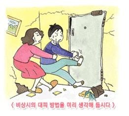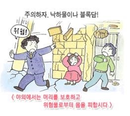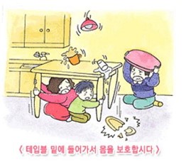 ・ 지진이 발생하였을 때 모든 가족은 위험한 장소를 피하여 안전한 장소로 대피합시다.