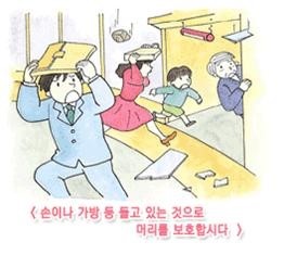・ 지진 발생 때는 유리창이나 간판 등이 떨어져 대단히 위험하므로 서둘러서 밖으로 뛰어나가면 안됩니다.